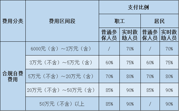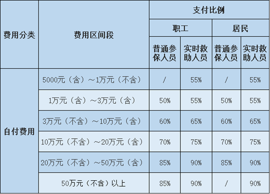 不同人群(普通参保人、实时救助人员)的起付线和比例不一样,咱们直接看“干货表格”,一目了然: